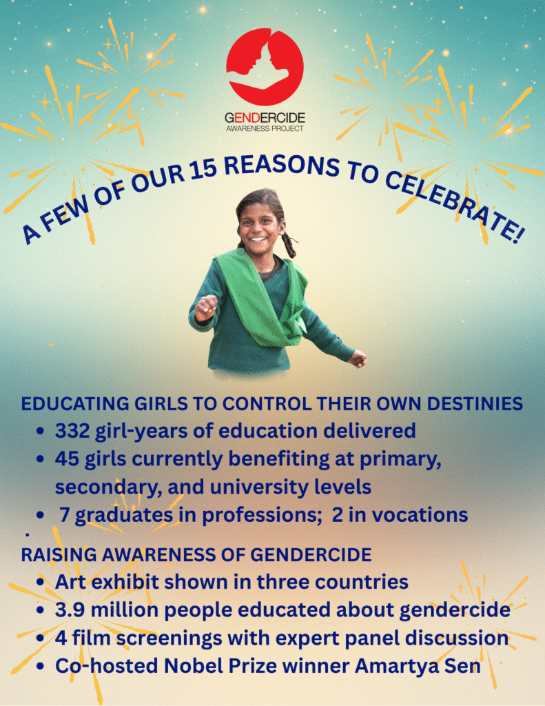 “Girls’ education is the best long-term strategy to end gendercide. Your contributions help us educate girls in seven countries — from preschool to college.”